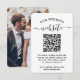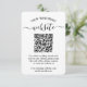 Dela ett av dina förlovnings- eller bröllopsfoton och förenkla RSVP-svar med snygga moderna QR-kodkort. Bilden och all text är enkla att anpassa. För att skapa din egen QR-kod med generatorn skriver du helt enkelt webbadressen i mallen. Genom att skanna kortet med sina telefoner skickas gästerna direkt till bröllopswebbplatsen för att svara på inbjudan och för mer information, såsom presentlista, vägbeskrivning och boende. En online-RSVP-process minskar risken att kort försvinner i posten. Det är också mer mångsidigt, eftersom du kan begära mer detaljerad information, såsom måltidsval, födoämnesallergier och låtförfrågningar. All svarsinformation kan anpassas eller raderas. Den svart-vita designen har modern minimalistisk typografi, handskriven kalligrafi, 1 anpassad QR-kod och 1 bild efter eget val. Detta kort är ett stilrent sätt