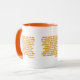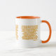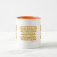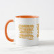 I det här tvåtonsmönstret i mugg visas ett mönster med ett Battle Scarred print-typsnitt med gult brev orange-konturen som innehåller den "1 Timothy 1:9-10" KJV-bibelskripturen verterad över en vit bakgrund i det här trosbaserade temat. Den här versen refererar till Bok i 1:a timotesiska kapitlet som visar verserna 9 till 10 i detta bibelcitattematod från Kung James bible. Behållaren och fälgen är glaserade i motsvarande färg i 11 eller 15 uns stora mikrovågsugn och säker keramikkonstruktion av diskmaskiner.