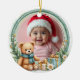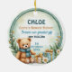 Celebrate your little one’s holiday debut with this heartwarming ornament featuring a cuddly bear in a teal scarf, nestled among wrapped presents, golden stars, and lush winter foliage. With soft watercolor accents and a circular green border, this keepsake captures the magic of a first Christmas with elegance and joy.