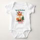 This baby bodysuit is pure holiday sass wrapped in snuggly softness. Front and center: a fox so charming it could outshine the tree topper, rocking a Santa hat and sitting beside a gift that’s probably full of giggles. Snowflakes swirl like nature’s glitter, and the green “My First Christmas” headline lets everyone know this is baby’s grand yuletide debut.