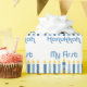Festivalen av ljus planlägger för bebis 1st Hanukkah som presenterar roliga blåttstearinljus med polka dots och randar och davidsstjärnan. Textnågot att säga MIN FÖRSTA HANUKKAH. PinkInkArt original!