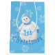Den gulliga snögubben med luddiga den blåttmittens, hatten och scarfen ler i en mjuk snö av nätt snöflingor på detta första jul som gåvan hänger lös för bebis med anpassningsbarnamn. Personifiera namn genom att använda den förutsatt att mallen.