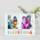 Festiv och trendig, detta stilrena julkort med foto kommer att glädja dina vänner och familj. Lätt att skapa ditt eget personliga julkort med vår mall för foto och text. Lägg helt enkelt till din egen bild och anpassa texten. För bästa resultat, använd ett stort eller högkvalitativt foto. Säljs inte i butik, våra mönster är exklusiva! Fräscht och roligt mönster som sticker ut i mängden. 5 x 7 tum, kommer komplett med kuvert till varje kort Festiva HAPPY EVERYTHING Julkort utan religiösa symboler Välj mellan många olika former på våra anpassade kort!