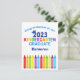 Det här älskliga vykortet för avgångselever i förskoleklass 2023 har en cool studentmössa ovanför färgglad text och en rad kritor i regnbågens färger. Sötsak förskoleklass avgångselev gratulationskort i roliga färger för den sista dagen i grundskolan med ditt barns namn anpassat i blått. Grattis till vår förskoleklass avgångselev!