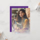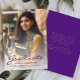 Modern studenten-avisering med ett foto av lodrät anpassningsbar. "Student" i ord visas i skript för lila, med student namn, skola och år studenten nedanför i sans serif-typsnitt. Byt enkelt ut exempelbilden mot ditt eget student-foto. Med en vit övertoning i skärm kan du kontrollera att textpekarna visas. Lägg till information om student resultat och framtida planer på motsatt sida i guld-färgad på en solid lila-bakgrund. Perfekt för högskoleexamen eller högskoleexamen.