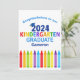 2024 års ynkliga studenten-kort har en coola- och färggradig textrad och en rad kritor i regnbåge. Kortet Cute anpassade-grattisar i student i roligt färg för grundskolans sista dag med personligen barn i namn i blått. Grattisar till vår släktargrad!