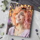 Modern minimalistisk examens tidskrift omslagsstil för anmälningskort med ett huvudfoto på framsidan och två mindre foton på baksidan. Baksidan har utrymme för ytterligare information som examenens prestationer, framtida planer eller detaljer om examensceremoni/fest.