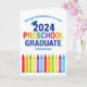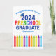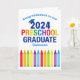 Den här roligten, 2024, har förkool studenten-kortet en coola i grad ovanför färgstark skrivning och en rad kritor i regnbåge. Kort för anpassade före-K student-grattisar i roligt färg för din förskola med personligen barn i blå skrift. Grattisar till vår PreK-grad!
