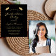 Den här klassiska, moderna inbjudan till studentfest innehåller guld-färgad-text på en svart bakgrund. Ord "Studenten" och namn i student står i avslappnad med ett modernt handskriftsteckensnitt under ett par guld granatkartonger. Anpassa inbjudan med information om party och ersätt exempelbilden på baksidan med ett foto av din grad.