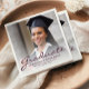 Modern studentfest-blöjor med anpassningsbar-foto med textövertäckning. Byt enkelt ut exempelbilden mot ett foto av student. Ord "Student" visas i burgundskript för handskrift, med namn, skola och år studenten nedanför i sans serif-teckensnitt. Ett vitt övertäckt övertoning hjälper till att göra så att den dolda texten dyker upp. Perfekt för högskoleexamen eller högskoleexamen.