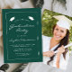 Den här klassiska, moderna inbjudan till studentfest innehåller vit text i ett tunt vitt rektangulärt gräns mot mörk grönt bakgrund. Ord "Studenten" och namn i student står i avslappnad med modernt handskriftsteckensnitt under ett par vita pantskärmar. Anpassa inbjudan med information om party och ersätt exempelbilden på baksidan med ett foto av din grad.