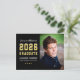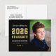 Meddela din examen från gymnasiet med stil med detta examensmeddelande och inbjudan till fest i form av ett vykort. Dubbelsidigt kort med en enkel och manlig design med text inspirerad av sporttröjor, perfekt för din stjärnelev och idrottsstjärna. Svarta, gyllene och vita färger. Utrymme för att inkludera ett seniorfoto på framsidan med text för inbjudan till fest på baksidan. Alla färger kan anpassas.