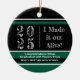 2025 Green and Black Photo Graduation ornament is perfect for those jokesters! 2025 I made it out alive! Perfect gift for the graduate at Christmas this year! Celebrate your academic achievement with this unique graduation ornament! This black and green chalkboard-style design proudly declares 'I Made it out Alive!' alongside the graduating year 2025. Perfect for commemorating the hard work and dedication that led to this moment, this ornament is a wonderful keepsake for any graduate. Add a personal touch by including the graduate's name, honors, and high school for a truly special memento that captures the essence of their educational journey.