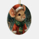 Cute 2025 ornament with a little mouse, all dressed up for the holidays in his Santa outfit and green scarf. The back of the ornament is red and green with a white snowflake.