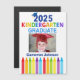 Roligten 2025 är tidskriften studenten i nyheten om förskolan i förskolan och har en coola som ligger över färgstarka skrivtecken och en rad kritor i regnbåge. Cute kindergartner student keepsakmagnet i roligt färg för grundskolans sista dag med barn-foto och namn-personlig i blått. Grattisar till vår släktare student!