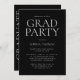 Den här enkla, moderna inbjudan till studentfest innehåller minimalistisk vit text på svart bakgrund. Lägg till informationen om student namn och party på kortets framsida och ett lodrät med ytterligare text på motsatt sida.