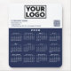 Modern professional calendar mouse pad features your business logo, a customizable QR code, company name and contact information in navy blue text on white over a white 2026 calendar on a navy color block. Add your logo, URL for the scannable code, company name, and custom text (website, phone number, address, or slogan) in the sidebar. Your logo can be any shape or color. Perfect for employees and a thoughtful gift for customers.