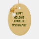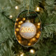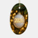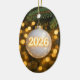 En glasyrde prydnad som symboliserar år 2026 hänger från en tallgren, upplyst av det varma skenet från mjuka gyllene ljus.