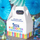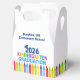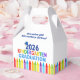 This customized 2026 kindergarten graduation party favor box features a cool grad cap above colorful writing and a row of crayons in rainbow. Cute kindergartner graduate design in fun colors for the last day of elementary school. Congratulations to our kinder graduates!