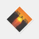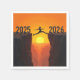 Silhouetterat mot en vibrerande orange solnedgång, ett stort kliv mellan två klippor märkta 2025 och 2026.