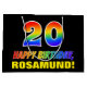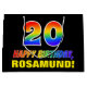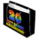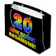 Den här färgstarka, glada och roligt födelsedagskalematerade presentsäcksdesignen har ett stort nummer "20" och meddelandet "GRATTIS PÅ FÖDELSEDAGEN,", som båda har en regnbågsspektrumövertoning som inspirerade mönster-färgning, tillsammans med en fet gult redigerbar mottagare av namn. Bakgrunden är svart på färgad. En roligt presentsäck av det här slaget kan användas när man slår in presenter som ges till någon i firande på sin tjugonde födelsedag. [~Z0000477]