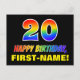 Framsidan av denna färgstarka, roligt- och glansfulla vykortsdesign på födelsedagen innehåller ett stort nummer "20" och meddelandet "GRATTIS PÅ FÖDELSEDAGEN", som båda har en regnbågsspektrumövertoning som inspirerade mönster-färgning, tillsammans med en fet gult anpassade mottagare namn. På framsidan finns också en svart bakgrund med oformaterad färgad. Baksidan av vykortet innehåller ett hälsning-meddelande från anpassadets födelsedag, eller så kan det kanske rensas och lämnas tomt om ett meddelande ska skrivas för hand i stället. Ett spännande vykort för anpassadets födelsedag som detta kan vara ett roligt för att erkänna någons tjugonde födelsedag. [~Z0000474]