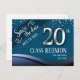 Spara datumet gymnasie- eller klassåterträff postkort. Blått tema med falskt folie silver 20:e med fet vit text. All text är anpassningsbar förutom 20 och kan ändras för dina egna festbehov. Klassbanderoller finns också i min butik.