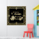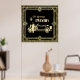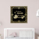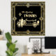 Ett svart och guld konst-deco, nära 1920:s bild av en man i kostym bredvid en antikisk bil.