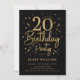 20th birthday party invitation in black and gold. Trendy modern design, perfect for a stylish men's or women's bday celebration. Features script font and confetti. Customize with your own details. Printed Zazzle invitations or instant download digital printable template.