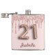 En gåva från vänner för en girig och glamorös 21-årsdag. En ljusare ro guld, rosa bakgrund med elegant faux guld drops, färgdroppstift. Texten: namn är skrivet i mörk ro guld med ett modernt handskript i stil. Anpassa och lägg till ett namn. Nummer 21 är skrivet med ett stil-teckensnitt i ro guld. Tillbaka: texten och namnen.