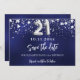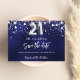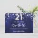 En modern och elegant Spara datum för en 21-årsdag party. En marin blå bakgrund med faux silver-stjärnor. Anpassa och lägg till ett datum och namn. Den blå färg är ojämn. Texten: Spara datumet skrivs med ett stort trendig-handskript i stil.