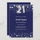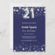 En modern, snyggt och glamorös inbjudan till 21-årsdagen party. En marin blå bakgrund, dekorerad med faux silver-stjärnor. Anpassa och lägg till ditt namn och information om party. Nummer 21 skrivs med ett stil-teckensnitt med ballong.