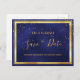 Spara datumkortet för en 21-årsdag party för en kille, man, man. En mörk blått bakgrund som är dekorerad med guldkonetti och faux guld och svart ram. Den blå färg är ojämn. Mallar för ett datum och namn/ålder 21. Golden färgad brev. Texten: Spara datumet skrivs med ett stort trendig-handskript i stil. Bakåt: utformning av vanligt vykort.