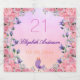 En blommigt i eleganten fick etiketten för en 21-årsdag för party eller te party. En romantisk violett, rosa och persikobakgrund för färgad, lila och rosa brev. Med söt Flowers i blått och ultraviolett blå, rosa och ro. En liten lavender färgad-fågel sjunger. Mallar för namn, 21 år och datum. Namn är skrivet med ett modernt handskript i stil. Brev och nummer i rosa, lila och guldgruva.