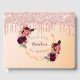 En gäst Bok för en 21-årsdag party. En gyllene och övertoningsbakgrund för rosa med en geometrisk ram för faux guld. Dekorerad med mörkens lila och burgundblommor, ro och boho stil fjädrar. Ro faux glitter droppar i faux, färgdropp på framsidan och baksidan. Mallar för namn, datum och ålder 21. Namn är skrivet med ett handskript i stil. Svart text. Datum och ålder som böjd text. Lägg till texten på ryggraden.
