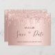 Ett girigt och trendig Spara datumkortet för en 21-årsdag party. En feminin rosa, ro guld faux metallisk tittar bakgrund som dekoreras med faux ro glitter drops. Mallar för ett datum och namn/ålder 21. Mörk ro guld färgad brev. Texten: Spara datumet skrivs med ett stort trendig-handskript i stil. Tips! Om du inte vill att det ska se ut som ett vykort klickar du på anpassa, går till baksidan och tar bort delaren och lägger till frimärke.