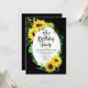 Klassi och stilfullt moderna solblommor och eukalyptus grey ram utformar "21:a födelsedagen Party" på en redigerbar svart bakgrund. Baksidan har en koordinerande solrosbukett även på en redigerbar svart bakgrund.