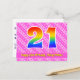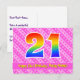 Framsidan av detta uppslag, lycklig, och det roliga födelsetalet med vykort har ett stort nummer "21" med en regnbågsspektrumövertoning som inspirerade mönster, tillsammans med meddelandet "Lycklig 21:a födelsedag" och en anpassningsbar mottagare namn. På framsidan finns dessutom en ljus rosa rosa i lycklig och i mörk strimlade mönster med hjärtformer. Baksidan innehåller ett redigerbart hälsning-födelsedagsmeddelande, eller så kan det kanske rensas och lämnas tomt om ett meddelande ska skrivas för hand i stället. Ett sådant här vykort för personligens födelsedag kan vara ett roligt för att skicka ett meddelande i firande om någons tjugoförsta födelsedag. Sådana vykort kan också användas för gäster från inbjudan till en födelsedagskalender eller för att hålla party för någon som blir 21 år gammal. [~Z0000449]