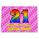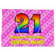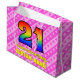 Den här festliga och uppseendeväckande 21:a födelsedagematoden i presentsäcken har ett stort nummer "21" med en mönster som inspirerats av ett regnbågsspektrum. Det innehåller också meddelandet "Lycklig 21:a födelsedag" och ett eget namn. Bakgrunden är en mönster av rand för ljus rosa rosa och mörk som innehåller levande hjärtformer av rosa. Sådana presentsäckar kan användas när presenter eller presenter förpackas för att hedra någons tjugoförsta födelsedag. [~Z0000414]