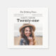 Önska glad födelsedag med denna unika tidningsliknande födelsedagsservett. Anpassa med ditt eget foto och namn. Designad för att likna en vintage tidning i klassisk svart-vit stil, är det ett sött och elegant sätt att fira att man fyller 21.