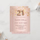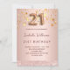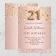 En modern, stilren och glamourös inbjudan till en 21-årsfest. En falsk rose gold metallisk bakgrund med falska guldstjärnor som droppas. Namnet är skrivet med en modern mörk rose gold färgad handskriven stilsnitt. Personifiera och lägg till din festinformation. Nummer 21 är skrivet med en ballongstilsskrift, script.