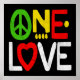 En Kärlek! Skadlig och färglös röd text, grönt & guld, "ONE KÄRLEK" inklusive FREDSTECKEN och HEART. Den här bilden innehåller ett citat från Kung i Reggae och symboliserar den levande musik, rytm och vibe som identifierar musigenre Roots/Reggae, Reggae culture, Jamaica & the Caribbean Island.