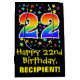 Denna pulserande, färgstarka och roligt-födelsedagspressformade formgivning har ett stort nummer "22" med en regnbågsspektralgradient stil mönster, tillsammans med meddelandet "Lycklig 22:a födelsedagen" och en redigerbar mottagare namn. Den har också en bakgrund i mönster med stjärnformer av olika storlek och färg. En roligt presentsäck som denna kan användas när man slår in presenter som ges till någon i firande på deras tjugoandra födelsedag. [~Z0000510]