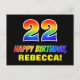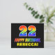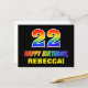 Framsidan av detta roliga, färgstarka och roligt-vykort har ett stort nummer "22" och meddelandet "GRATTIS PÅ FÖDELSEDAGEN", som båda har en regnbågsspektrumövertoning som inspirerade mönster-färgning, tillsammans med en fet gult anpassade mottagare namn. På framsidan finns också en bakgrund med svart färgad. Baksidan av vykortet innehåller ett hälsning-meddelande från anpassadets födelsedag, eller så kan det kanske rensas och lämnas tomt om ett meddelande ska skrivas för hand i stället. Ett färglöst vykort för personligens födelsedag som detta kan vara ett roligt för att erkänna någons tjugoandra födelsedag. [~Z0000474]