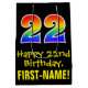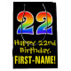 Den här färgstarka, spännande och roligt-födelsematade presentsäcksdesignen har ett stort nummer "22" med en regnbågsspektrumövertoning som inspirerade mönster, tillsammans med meddelandet "Lycklig 22:a födelsedagen" och en redigerbar mottagare namn. Bakgrunden är svart på färgad. En presentpåse som denna kan användas när en gåva eller present ge till heder för någons tjugoandra födelsedag. [~Z0000512]