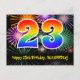 Framsidan av denna roliga, färgglada och spännande födelsedagstemanpassade vykortdesign har en stor siffra "23" med ett regnbågsspektrum-gradering-mönster, tillsammans med meddelandet "Grattis på 23-årsdagen", och ett redigerbart mottagarnamn. Framsidan har dessutom ett livfullt och färgglatt bakgrundsmönster inspirerat av utseendet på sprängande festliga fyrverkerier. Baksidan har ett anpassningsbart födelsedagsmeddelande, eller kanske kan tömmas och lämnas tomt om ett meddelande ska skrivas för hand istället. Ett personligt födelsedags vykort som detta kan vara ett roligt sätt att fira någon på deras tjugotredje födelsedag. Vykort som detta kan också användas för att inbjuda gäster till