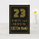 Framsidan av 1920-talet-1930-talet inspirerad av stil och vintagen ser ut att bli födelsedag med gratulationskortet har ett stort Art Deco-utseende inspirerat nummer "23", budskapet "LYCKLIG 23:e BIRTHDAY", ett redigerbart namn och ett gräns-mönster som består av linjer. Insidan innehåller ett redigerbart hälsning-födelsedagsmeddelande, eller så kan det kanske rensas och lämnas tomt om ett meddelande ska skrivas för hand i stället. Ett sådant här födelsedagskort i anpassadet kan vara ett roligt för att erkänna någons tjugotredje födelsedag. [~Z0000394]