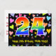 Framsidan av denna kärleksfulla, spännande och roliga födelsedagsteman postkort design har ett stort nummer "24" med ett regnbågsspektrum gradientinspirerat mönster. Den har också meddelandet "Happy 24th Birthday," och ett personligt mottagarnamn. Framsidan har dessutom ett livfullt och färgrikt mönster av kärleksfulla hjärtan. Baksidan har ett redigerbart födelsedagsgratulationsmeddelande, eller kan kanske rensas och lämnas tomt om ett meddelande ska skrivas för hand istället. Ett födelsedagskort som detta kan vara ett roligt sätt att skicka födelsedagsönskningar till någon som firar sin tjugofjärde födelsedag. Postkort som detta kan också användas för att bjuda in gäster till en födelsedagsfest eller fest som