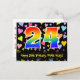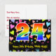 Framsidan av denna kärleksfulla, spännande och roliga födelsedagsteman postkortdesign har en stor siffra "24" med ett regnbågsspektrum-gradering-mönster. Den har också meddelandet "Grattis på 24-årsdagen," och ett personligt mottagarnamn. Framsidan har dessutom ett livfullt och färgglatt mönster av kärleksfulla hjärtan. Baksidan har ett redigerbart födelsedagsgratulationsmeddelande, eller kanske kan tömmas och lämnas tomt om ett meddelande ska skrivas för hand istället. Ett födelsedagskort som detta kan vara ett roligt sätt att skicka födelsedagsönskningar till någon som firar sin tjugofjärde födelsedag. Postkort som detta kan också användas för att inbjuda gäster till en födels