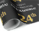 Den här eleganten och det lyxiga födelsedagstexten som omsluter den pappra designen innehåller meddelandet "LYCKLIG 24:e BIRTHDAY,", ett redigerbart namn, och födelsedagsnumret "24:e" med utseendet mönster inspirerat av faux/imitation guld. Bakgrunden är svart på färgad. Papper som denna kan användas när man slår in gåvor eller presenter som ges i firande på någons 24-årsdag. [~Z0000454]